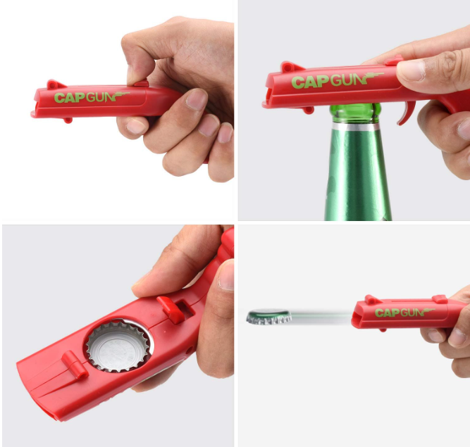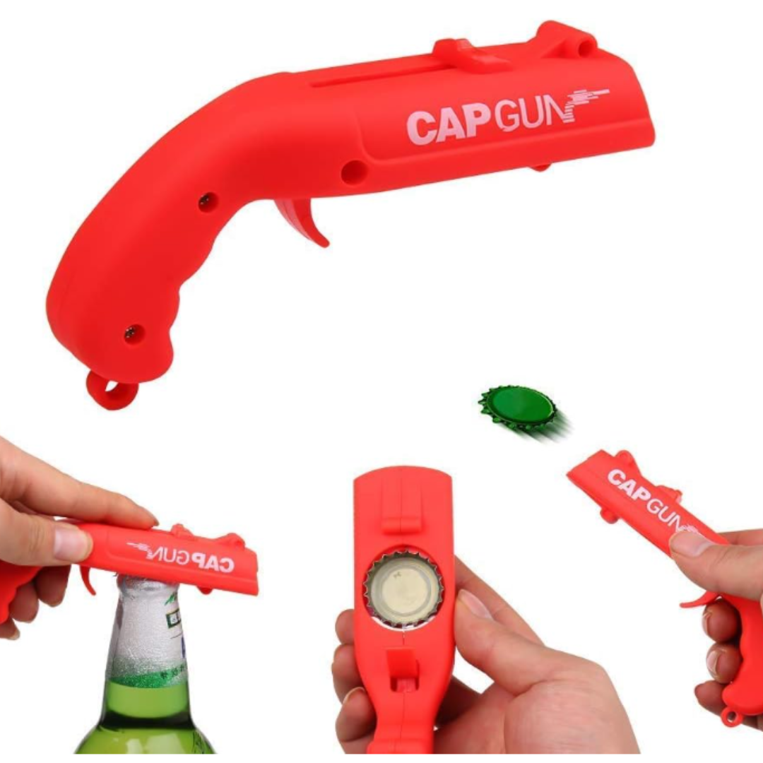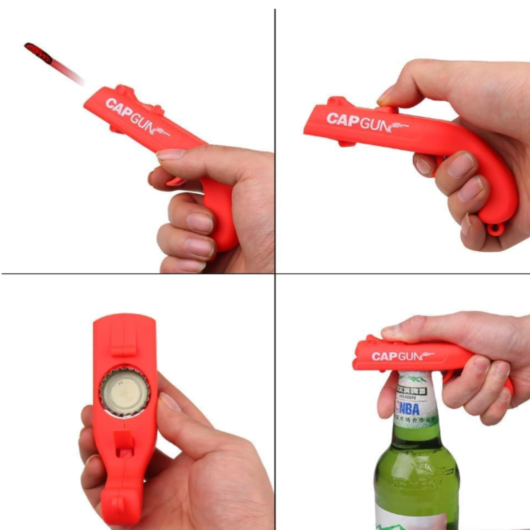 Convierte cualquier botella en motivo de diversión. Este destapador en forma de pistola abre tu bebida y ¡dispara la tapa a distancia🍺🔫✨